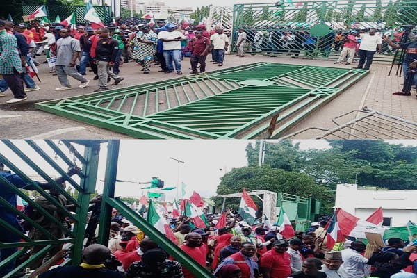 Protesters have pulled down the first gate of the National Assembly complex in Abuja and forced their way into the premises.