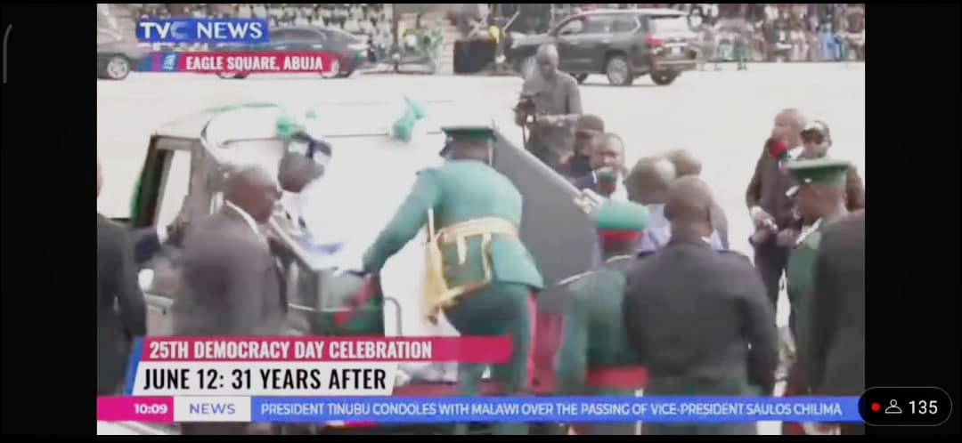 President Bola Tinubu missed his step and fell while walking into a vehicle that would convey him for a parade at Eagle Square in commemoration of Democracy Day.