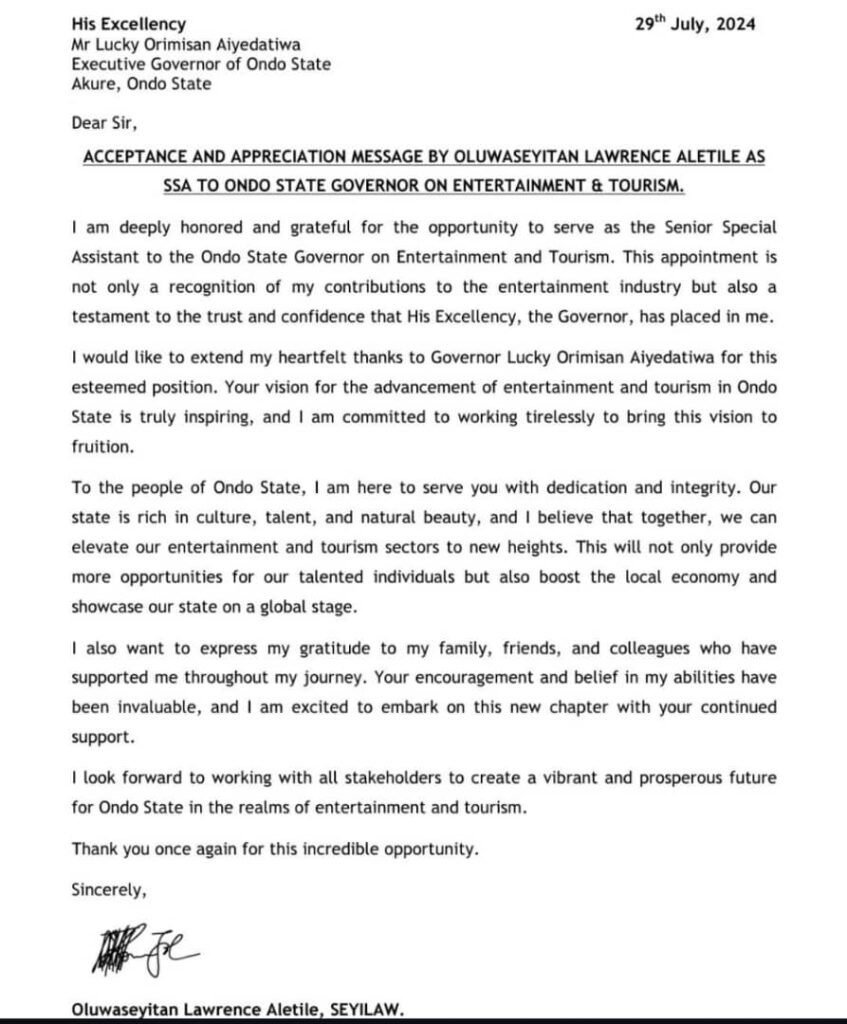 ACCEPTANCE AND APPRECIATION MESSAGE BY OLUWASEYITAN LAWRENCE ALETILE AS SSA TO ONDO STATE GOVERNOR ON ENTERTAINMENT & TOURISM.