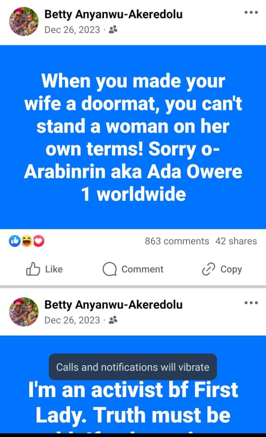 Her last post on December 26, 2023, a day before the death of her husband was “When you made your wife a doormat, you can’t stand a woman on her own terms! Sorry o- Arabinrin aka Ada Owere 1 worldwide”