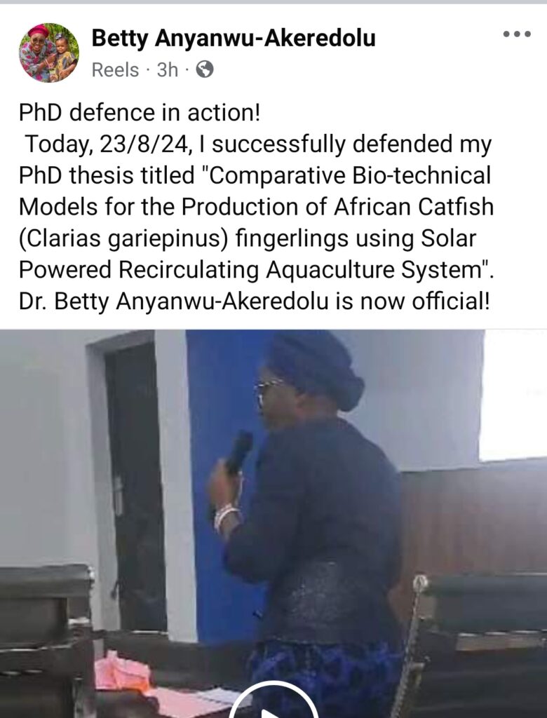 Today, 23/8/24, I successfully defended my PhD thesis titled “Comparative Bio-technical Models for the Production of African Catfish (Clarias gariepinus) fingerlings using Solar Powered Recirculating Aquaculture System”.