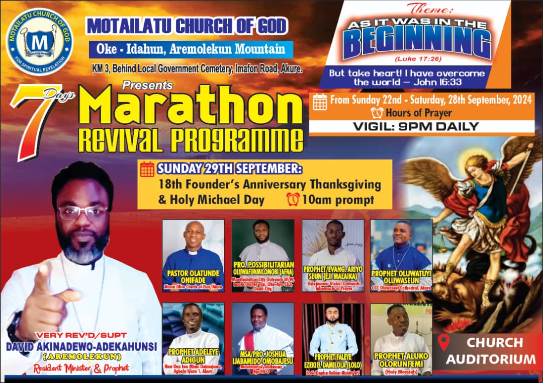 Motailatu Church of God, Oke-Idahun Parish, Aremolekun Mountain, Imafon Road, Akure, is set to celebrate its 18th Founder’s Anniversary in a unique 3-in-one ceremony.