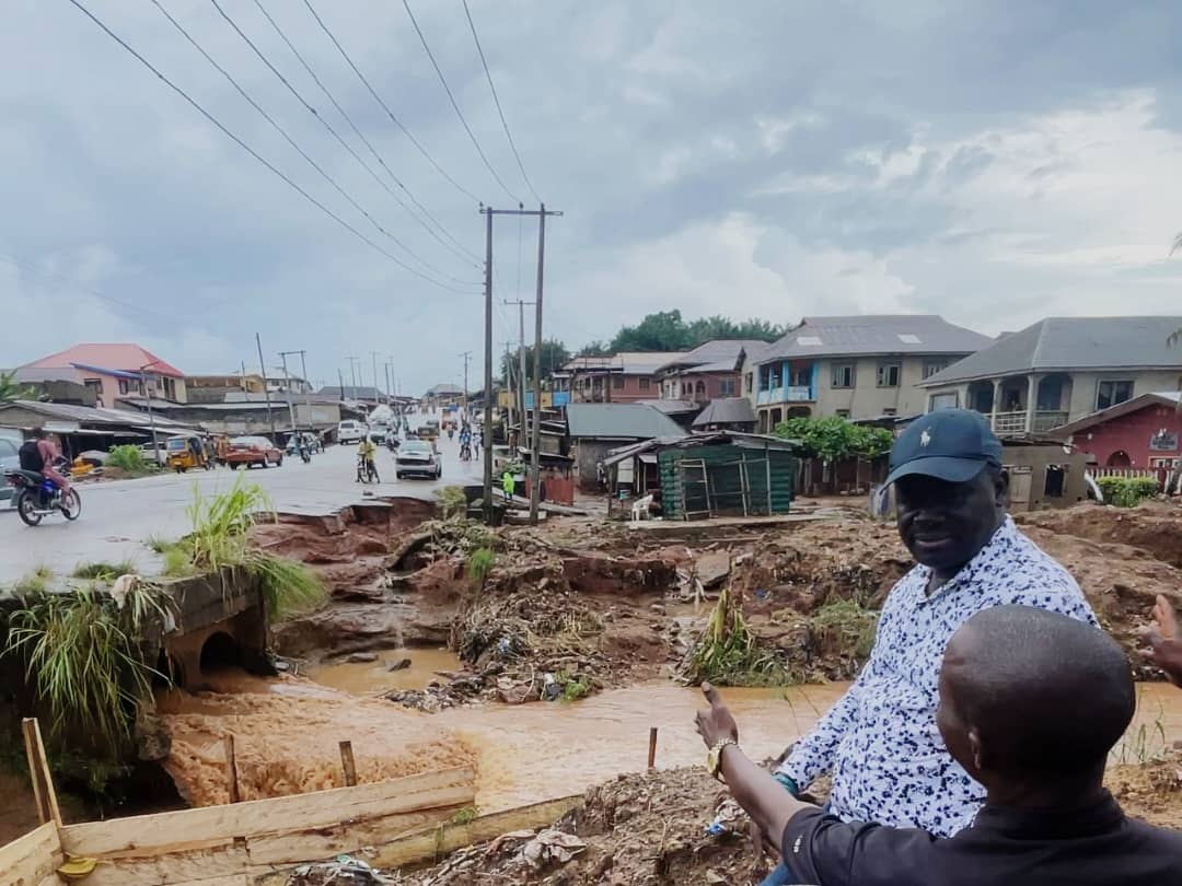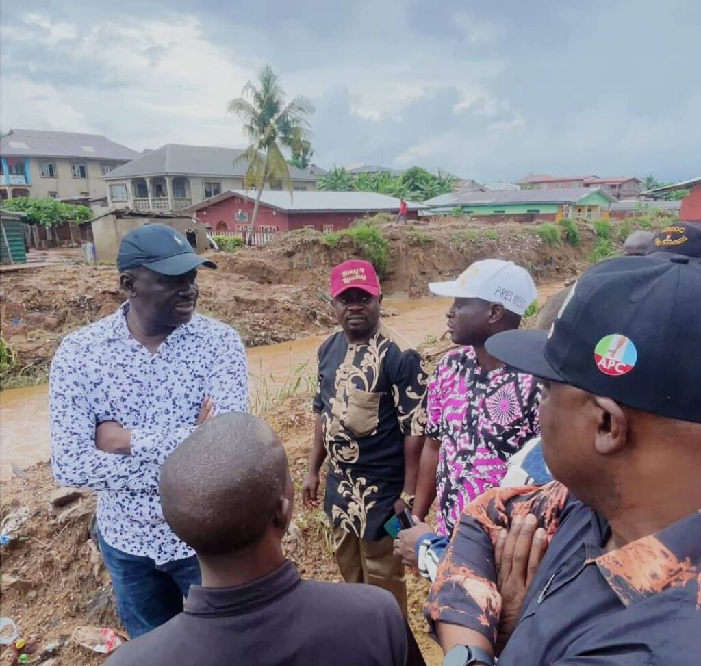 Following the flood which submerged parts of Ondo city on Friday, member representing Ondo East/West federal constituency in the green chamber of the National Assembly, Honourable Abiola Makinde, on Saturday paid an on-the-spot assessment to affected areas with the sole aim of finding lasting solution to the flooding and support residents affected.