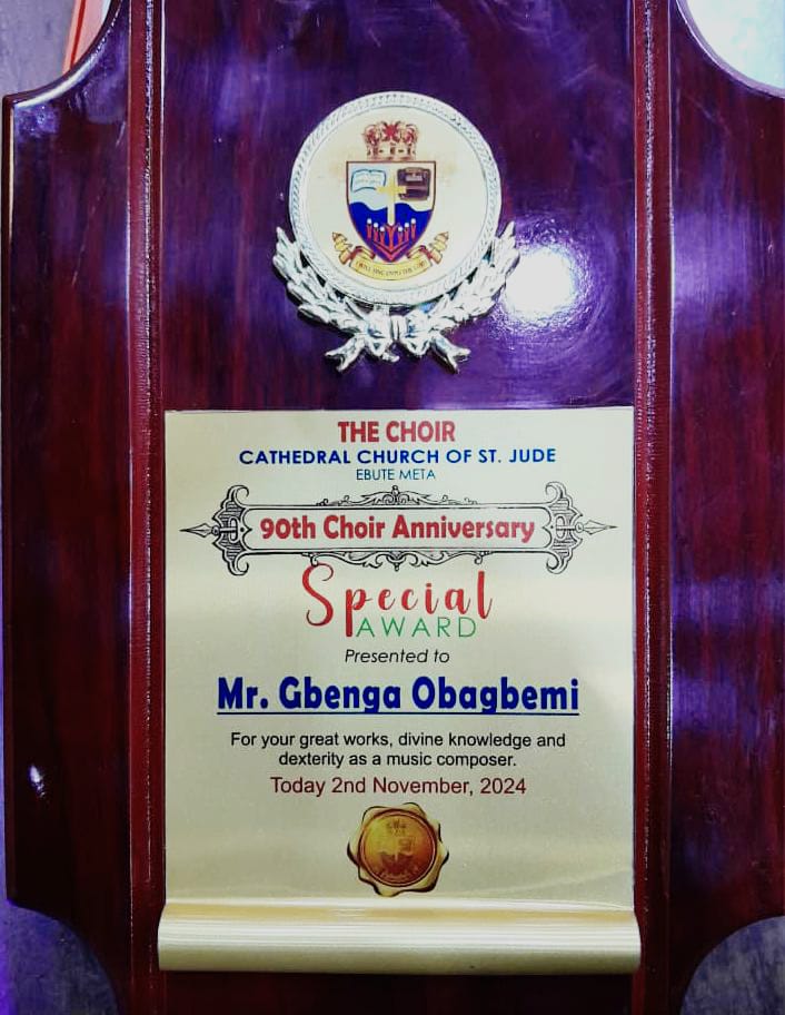 Similarly, at the 90th Choir Anniversary of the Cathedral Church of St. Jude, Lagos on Saturday, Obagbemi was presented with a Special Award “for your great work, Divine knowledge and Dexterity as a music Composer.“
