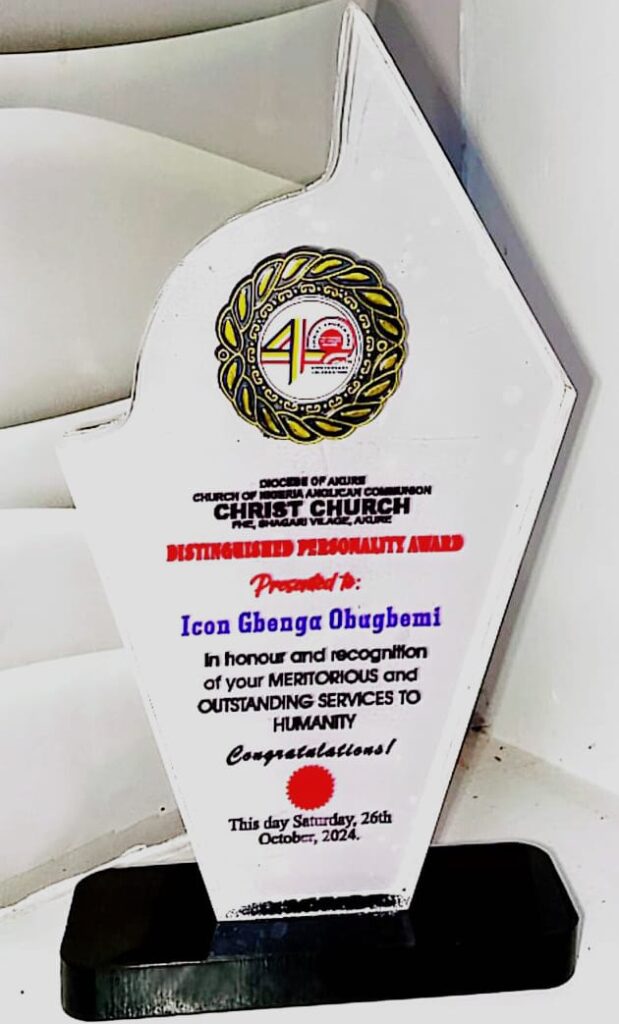 Icon Olugbenga Obagbemi received two impactful awards of recognition from the Cathedral Church of St. Jude, Lagos and Christ Church, Diocese of Akure, Anglican Communion in Ondo State.