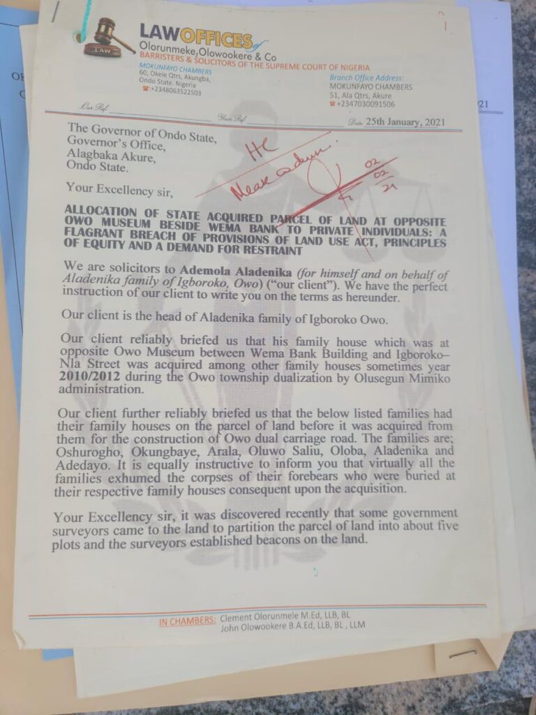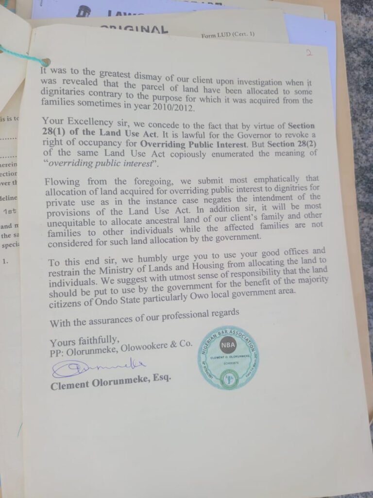 The group confirmed that while the late Governor Akeredolu did at one point approve a land allocation to Oba Ajibade, it was revoked after protests from the Aladenika family, who through their lawyer, Clement Olorunmeke, petitioned against it.
