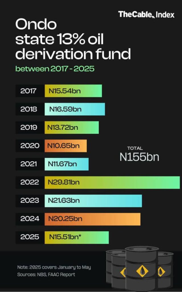 Ondo State has received a total of ₦155 billion as its share of the 13% oil derivation fund between 2017 and 2025, according to official figures from the National Bureau of Statistics (NBS) and FAAC reports.