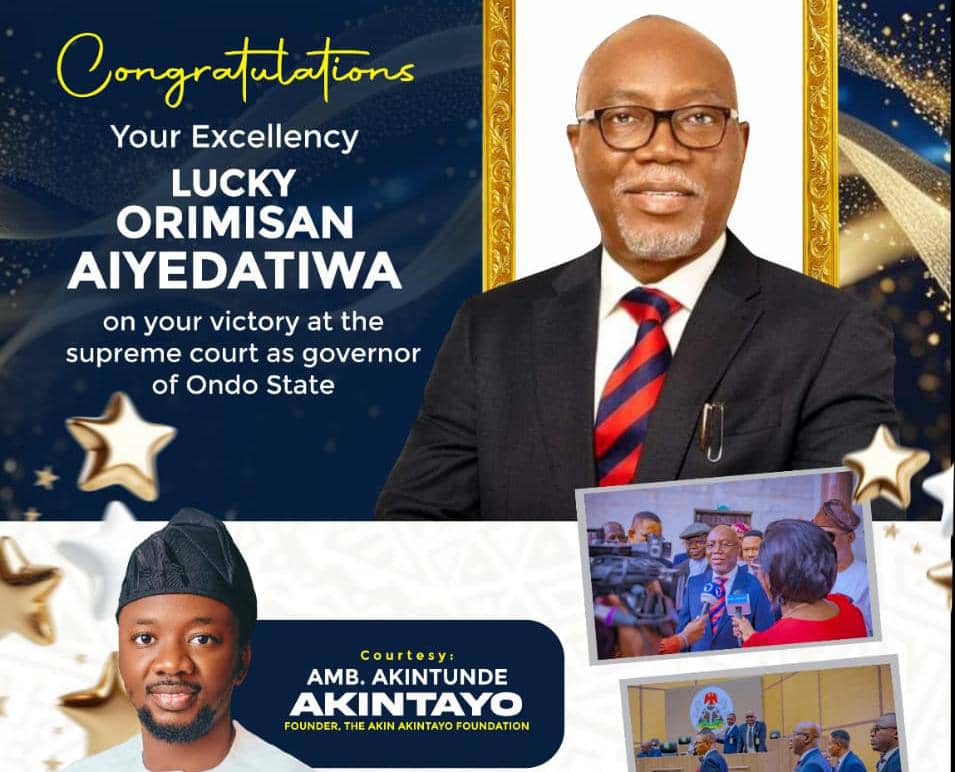 Ambassador Akintunde Akintayo has congratulated Ondo State Governor, Lucky Aiyedatiwa, on the Supreme Court verdict that affirmed his victory in the November 2024 governorship election.