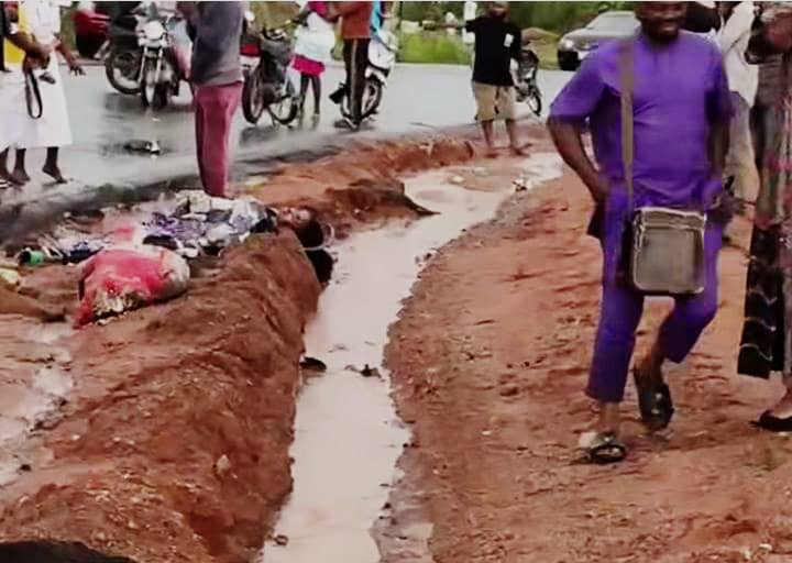 A video shared on Facebook by Bola Awofisayo showed the lifeless bodies of victims laid by the roadside, while the driver of the bus remained trapped behind the wheel.